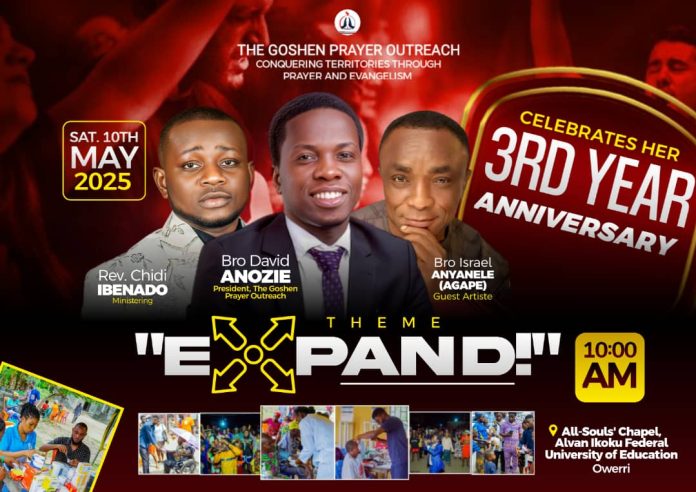 “Goshen Prayer Outreach is thrilled to announce the 3-year anniversary of The Goshen Prayer Outreach holding tomorrow being Saturday 10th May, 2025 at All Soul’s Chapel, Alvan Ikoku, Federal University of Education, Owerri, a vibrant community of prayer and evangelism dedicated to spreading hope and transforming lives.”